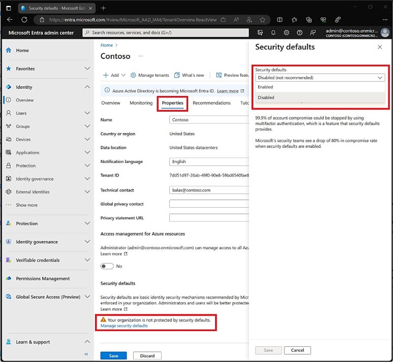 [ID] – [개요] -[속성]에서 “보안 기본값 관리”를 선택합니다.