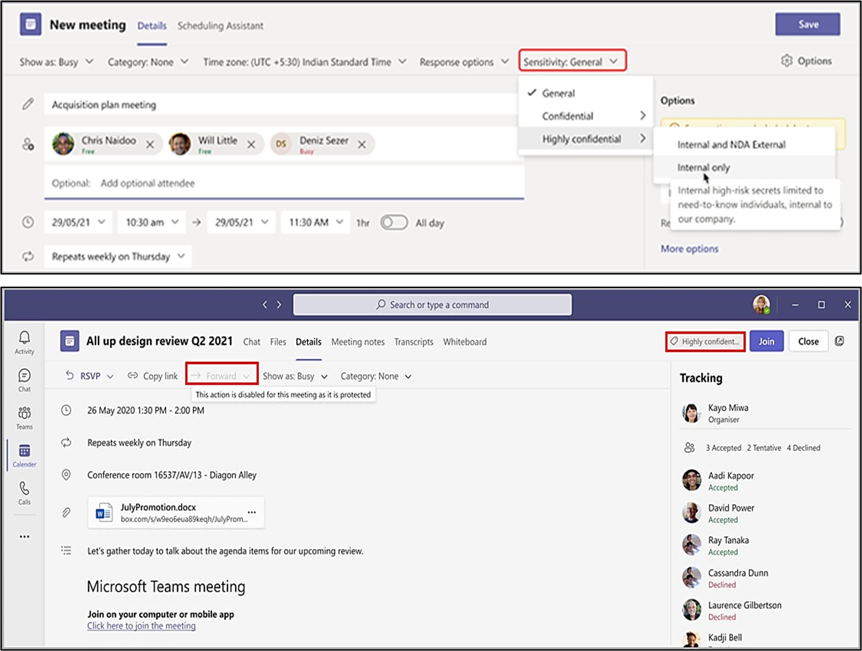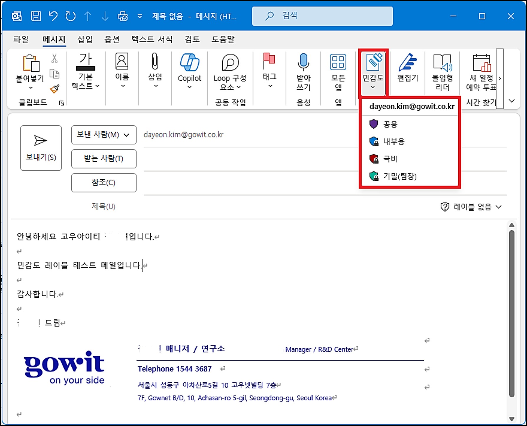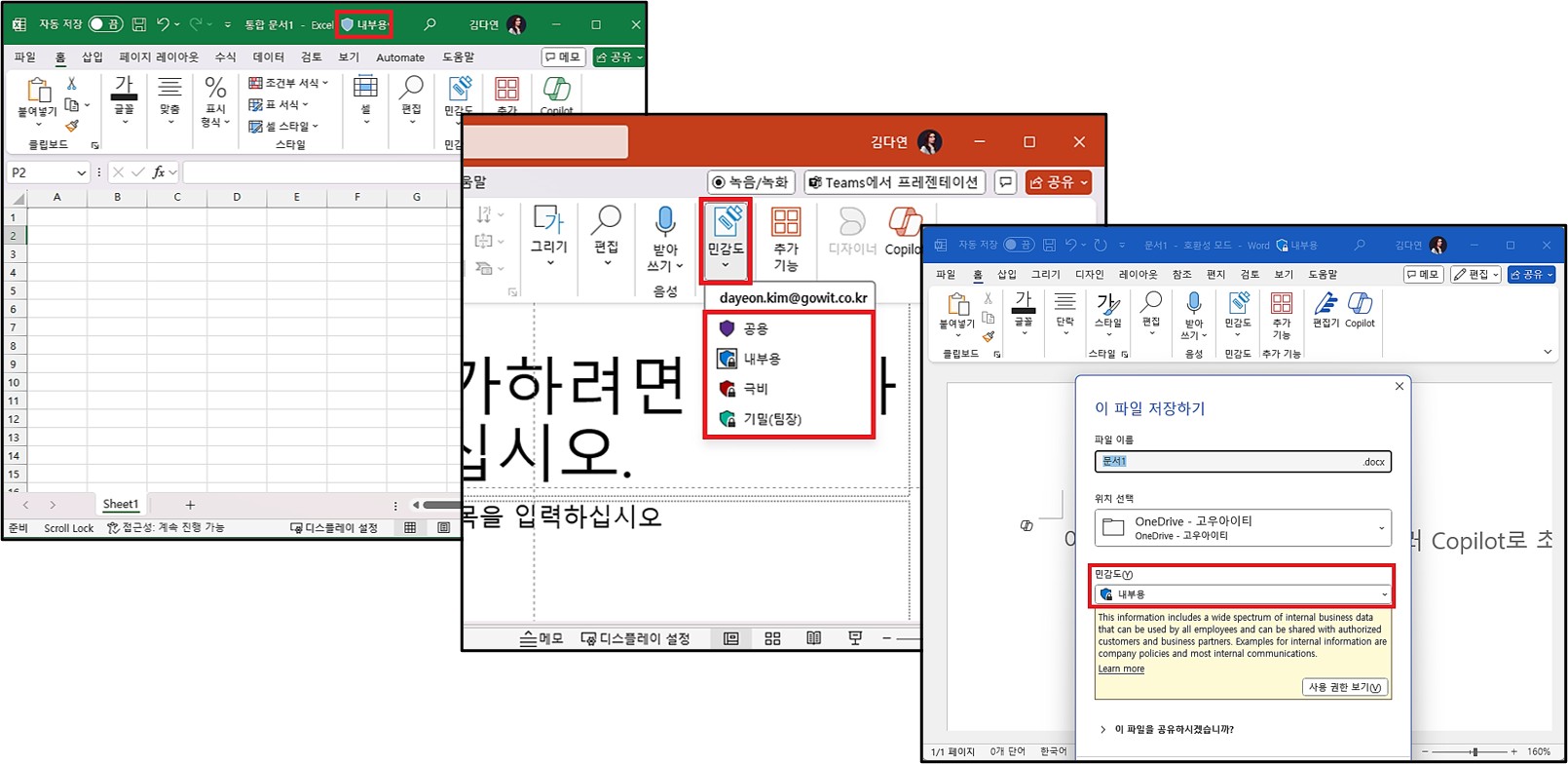 먼저 오피스 앱(Office App), 아웃룩, Teams와 같이 다양한 서비스에서 레이블이 어떻게 적용되는지 적용된 예시 화면을 함께 살펴보실까요?
