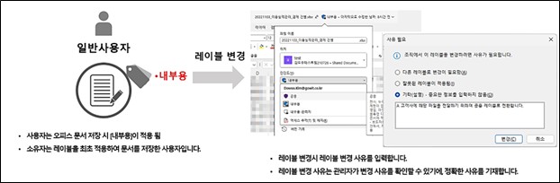 기존 문서를 열고 저장할 때 사용자 또는 부서별로 사전에 설정된 레이블이 자동으로 적용됩니다. 이때 적용된 레이블이 적합하지 않다면 사용자가 변경 가능하도록 설정합니다.