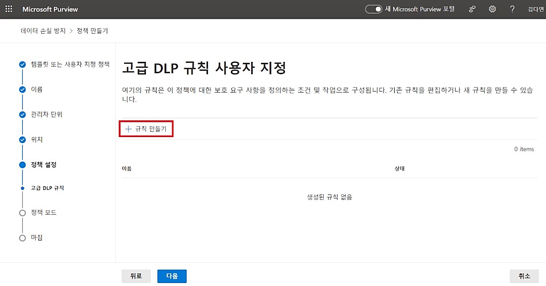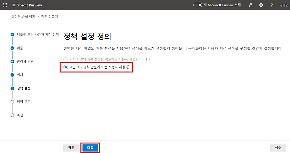 (6) [ 고급 DLP 규칙 만들기 또는 사용자 지정 ]을 선택 후 [ 다음 ]을 클릭합니다.