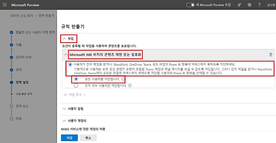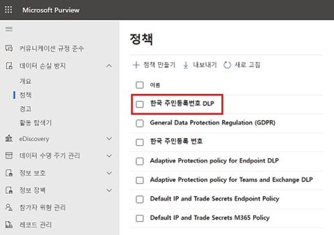 (1) 관리자 계정으로 [Microsoft Purview] – [데이터 손실방지] – [정책 메뉴]에 접속합니다.