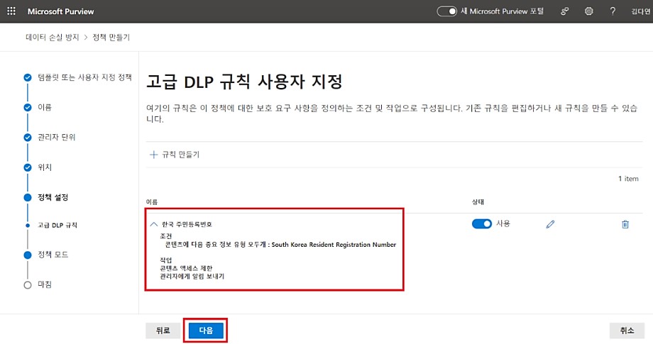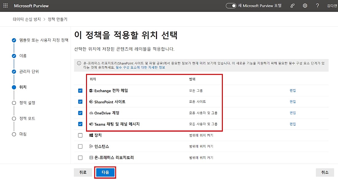 (5) DLP 정책을 적용할 위치 및 범위를 지정하고, [ 다음 ]을 클릭합니다.