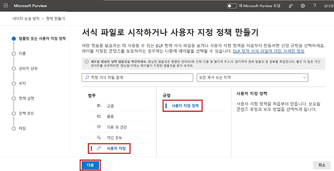(3) 한국 주민등록번호의 경우, [ 사용자 지정 ] 정책을 통해 선택할 수 있기 때문에 [ 사용자 지정 ] -[ 사용자 지정 정책 ]을 선택 후 [ 다음 ]을 클릭합니다.