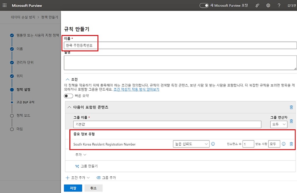 (8) [ 이름 ]과 [ 중요 정보 유형 ]을 설정합니다.