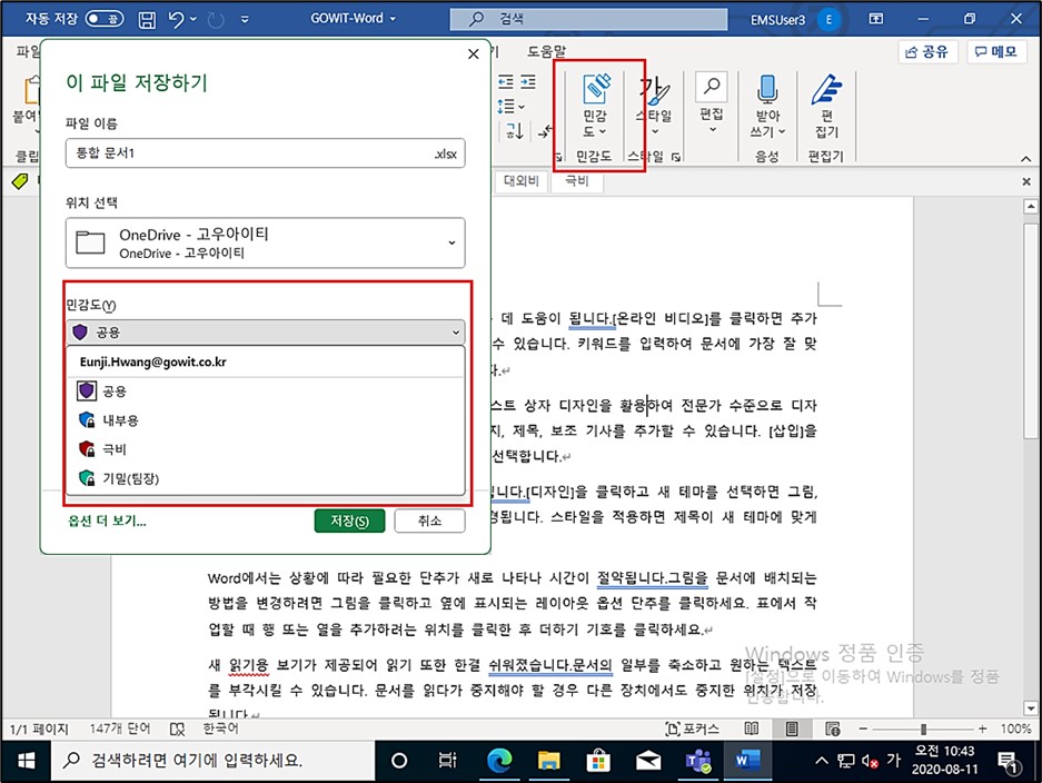 사용자는 문서에서 [민감도] 메뉴를 확인할 수 있으며 정책에 따라 설정할 수 있는 레이블을 선택하여 문서를 암호화 합니다.