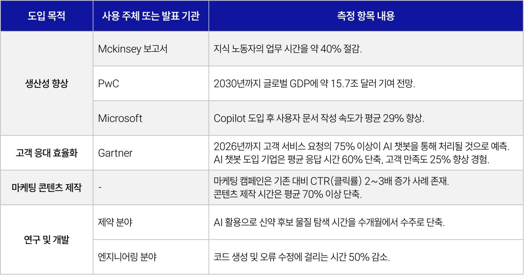 생성형 AI 도입에 따른 업무 생산성 향상은 도입 목적별 다양한 사례를 확인할 수 있습니다. [표 1]은 도입 목적별로 확인할 수 있는 대표적인 사례이니, 이를 참고해 기업에 맞는 목표를 수립하시기 바랍니다.