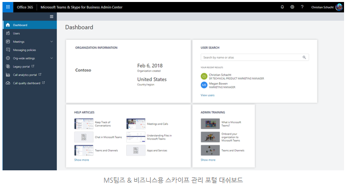 위 그림의 왼쪽 상단에서 “Microsoft Teams & Skype for Business Admin Center”라는 문구를 확인하실 수 있습니다. 새로운 통합 대쉬보드를 통해 MS팀즈와 스카이프 항목들을 함께 관리할 수 있고 회사의 전화 통화 분석 (Call Analytics)과 전화 품질 (Call Quality) 대쉬보드도 이용할 수 있습니다. 물론 MS팀즈와 스카이프 관련 설정 작업들을 이 통합 포털에서 모두 처리할 수 있습니다. 통합 포털에서 제공하는 기능 몇 가지를 살펴보겠습니다.