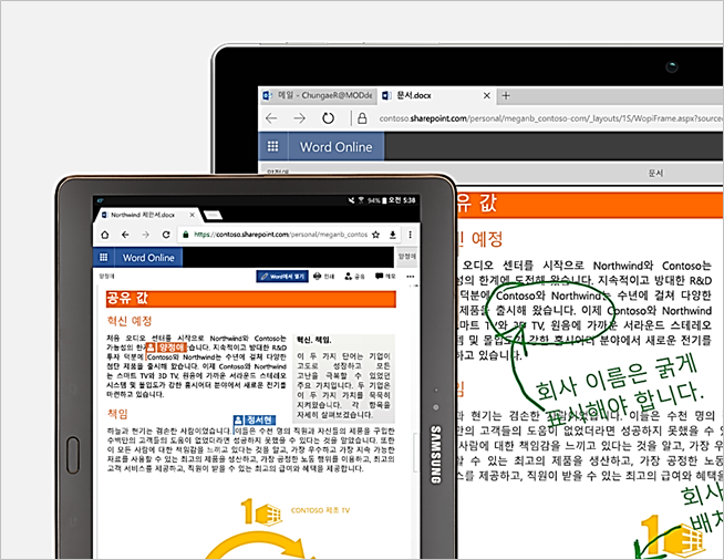 비즈니스용 OneDrive에 저장된 문서는 Word 및 PowerPoint와 같은 오피스 프로그램과 온라인 오피스에서 실시간으로 권한이 있는 다른 사용자와 공동으로 실시간 작업할 수 있어, 조직 내부 또는 외부 사용자와 언제 어디서나 빠르고 편리하게 작업할 수 있습니다.