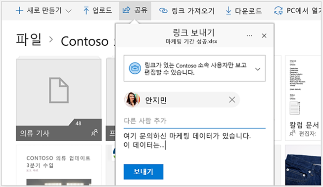 조직 내부 구성원 뿐 아니라 조직의 정책에 따라서 사용자는 조직 외부 사용자와도 정보를 공유하고 함께 작업할 수 있습니다.