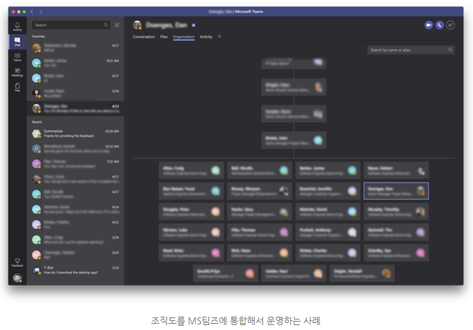 아래 이미지는 Zebra Technology라는 기업이 MS팀즈와 액티브 디렉토리 기반의 조직도를 통합해서 운영하는 사례입니다. 기업의 규모가 클수록 이런 요구 사항이 많은데, MS팀즈에게는 일도 아니죠.