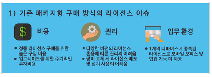 지금까지 많은 기업들은 ‘패키지형 SW’를 구매해서 활용하고 있습니다. 한컴의 아래한글, MS 오피스 제품 등이 대표적이고 기업들이 기간 업무에 사용하는 서버용 SW, 데이터베이스, 이메일 서버 등도 대부분 이 방식이라고 할 수 있습니다. 이미 오랜 기간 이런 방식으로 구매해 사용해 왔는데 무슨 애로사항이 있을까요?