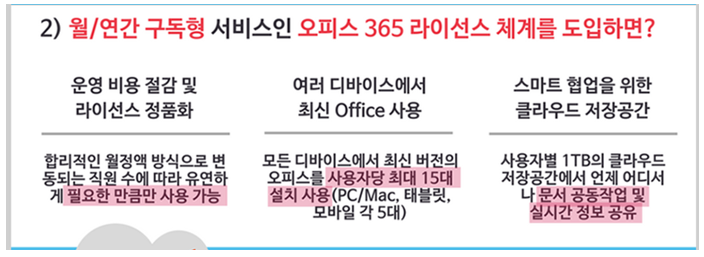 저희 고우아이티는 여기에 해당하는 패키지 SW를 설정하고 이 녀석부터 클라우드 기반의 ‘구독형 라이선스’로 전환하는 방법을 추천해 드립니다. 예를 들어, 위 질문을 통해 선택된 패키지 SW가 MS오피스라면 클라우드 기반의 오피스 365로 전환하는 것이 최적의 솔루션입니다.