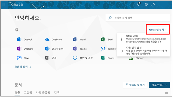 ① Office 365 홈 포털에 접속한 후 [Office 앱 설치] 단추를 클릭합니다.
