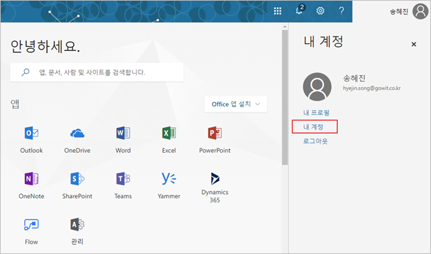 ① 먼저 포털에 로그인 후 오른쪽 상단의 사용자명을 클릭하여 [내 계정]을 선택합니다.