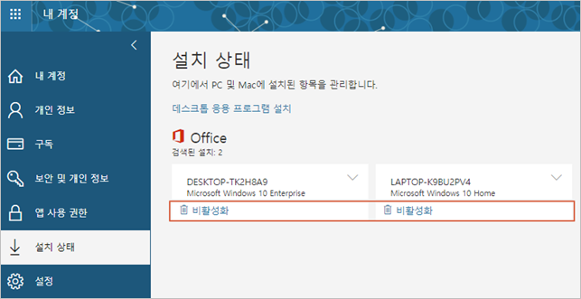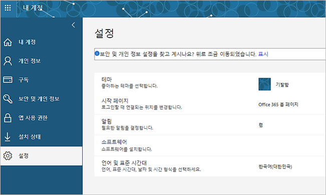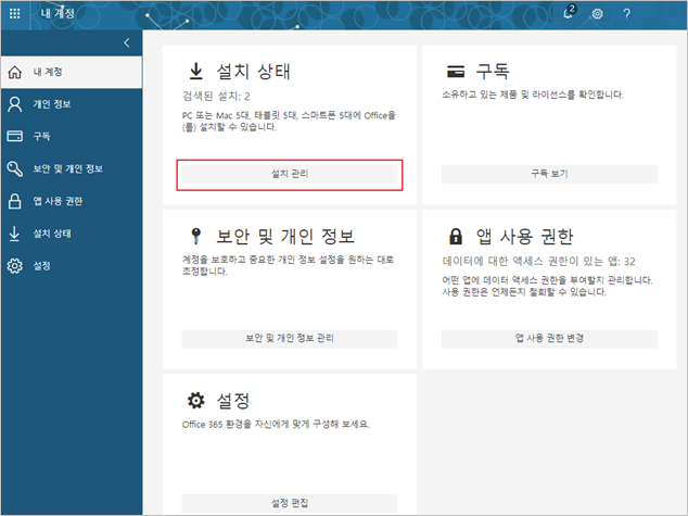 오피스 365 홈 포털 내 계정 관리를 통해 오피스 프로그램 및 라이선스 관리를 할 수 있습니다.