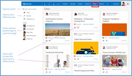 Delve는 MS그래프가 제공한 오피스 365 사용자의 일정관리 및 이메일 사용 데이터 등을 분석해 구성원들이 어떤 업무에 얼만큼의 시간을 사용하는지, 무슨 문서 작업을 했는지를 파악할 수 있습니다. 또한 특정 업무에 투입하는 시간이 얼마나 되는지, 어떤 동료와 가장 많은 시간을 협력하는지 그리고 업무 시간 외에 일하는 추가로 시간이 얼마나 되는지를 보여줍니다.