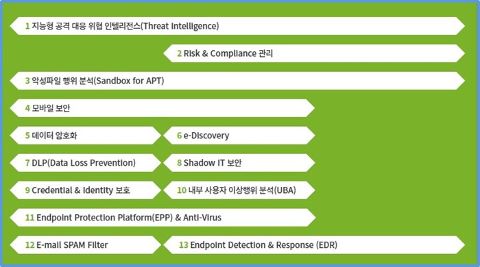 Microsoft 오피스 365에 적용되고 보안 요소들을 그림 한 장으로 살펴보면 다음과 같습니다: 맨 위에 “지능형 공격 대응 위협 #인텔리전스 “가 자리 잡고 있습니다.