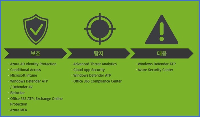 오피스 365 서비스는 보안을 3단계로 구분하고 특정 상황에 가장 적합한 요소들 (그림에 나타난)을 활용해 보안 능력을 극대화합니다. 보안 3 단계는 “보호” >> “탐지” >> “대응”으로 구성됩니다: