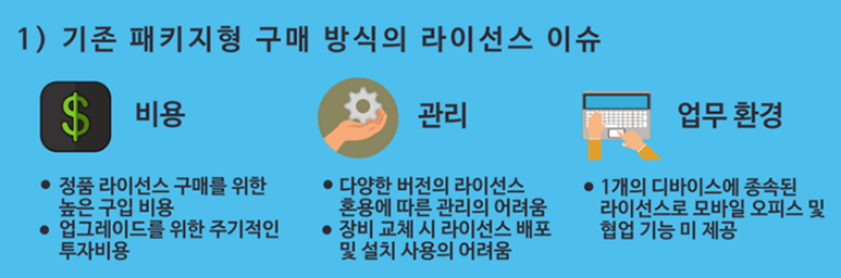 지금까지 표준 방법처럼 이용되어 온 패키지 방식의 SW라이선스 관리의 어려움과 복잡도는 경험해 보신 분들은 잘 알겁니다. 그래서 기존 방식의 이슈들을 먼저 정리해 보았습니다.