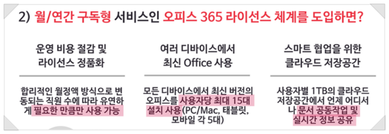 오피스 365는 시스템 구축과 SW 도입을 위한 엄청난 초기 투입 비용이 없습니다. 사용한만큼 월 비용을 내는 방식입니다. 그리고 몇 년에 한 번씩 목돈을 요구했던 업그레이드 비용도 없습니다. 당연히 현금흐름에 긍정적인 효과를 주겠죠.