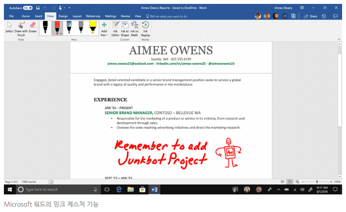 잉크 제스처 기능은 MS 워드에 추가된 기능입니다. 사용자가 필기한 내용을 문서로 변환하고 기존 내용들과 연계해주는 기능인데 워드에 포함되어 있는 ‘펜’ 기능을 통해 이용할 수 있습니다. 예를 들어, 워드에 입력되어 있는 한 문장을 여러 개 단락으로 나누거나, 기존 문장 사이에 단어를 추가할 수 있습니다. 일련의 작업들을 펜으로 노트에 필기하듯이 자연스럽게 처리할 수 있다고 하네요. 저도 아직 써보지는 않았지만 사용하는 노트북이 필기가 가능하기 때문에 바로 테스트해 볼 생각입니다. 역시 이 잉크 제스처 기능도 A.I 기술이 적용되었습니다.