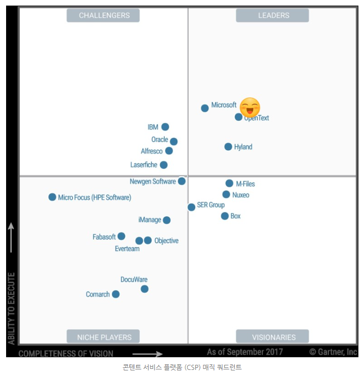 클라우드 서비스, SNS를 이용한 협업, 모바일 및 분석 기술은 디지털 비즈니스에서 필요한 콘텐츠에 대한 요구와 기대를 지속적으로 변화시켜 왔습니다. 콘텐츠의 다양성과 규모가 계속해서 커지고 있기 때문에 IT와 현업 부서의 리더들이 콘텐츠를 사용하여 디지털 비즈니스 프로세스를 보완하거나 추진하는 것은 필수 조건이 되고 있습니다. 그리고 이미 오랜 전부터 형성되어 온 콘텐츠 관리 제품 및 솔루션 시장은 플랫폼, 응용 프로그램 및 구성 요소의 세 가지 영역으로 진화하고 있습니다. 시장시장 전문기업인 Gartner 컨설팅이 2017년 11월에 발표한 콘텐츠 서비스 플랫폼 (CSP) 솔루션들에 대한 Magic Quadrant (매직 쿼드런트) 보고서는 마이크로소프트의 쉐어포인트 온라인 (Sharepoint Online)서비스를 CSP 분야의 리더로 선정했습니다. 그 주된 내용을 요약해서 공유해 드립니다.