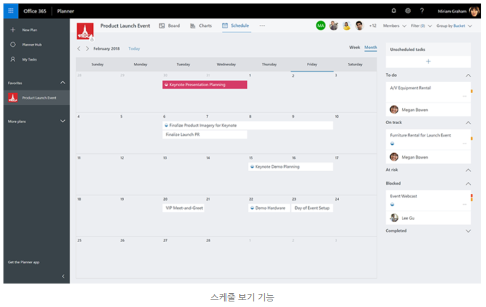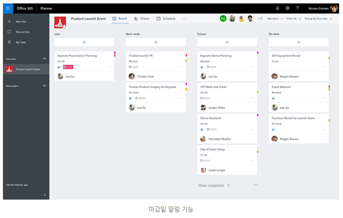 이번 기능 업데이트를 통해 전체 스케줄 보기가 가능해졌습니다. 이를 통해 팀 관리자나 프로젝트 리더들이 MS플래너에 등록된 프로젝트나 업무 마감일을 관리하고 앞으로 다가 올 업무를 계획하는 일이 휠씬 더 쉬워졌습니다. 주단위, 월단위 태스크 보기 화면에서 업무 일정의 드로그 앤 드롭 기능이 지원되기 때문에 사용상의 편리함도 더 좋아졌습니다.