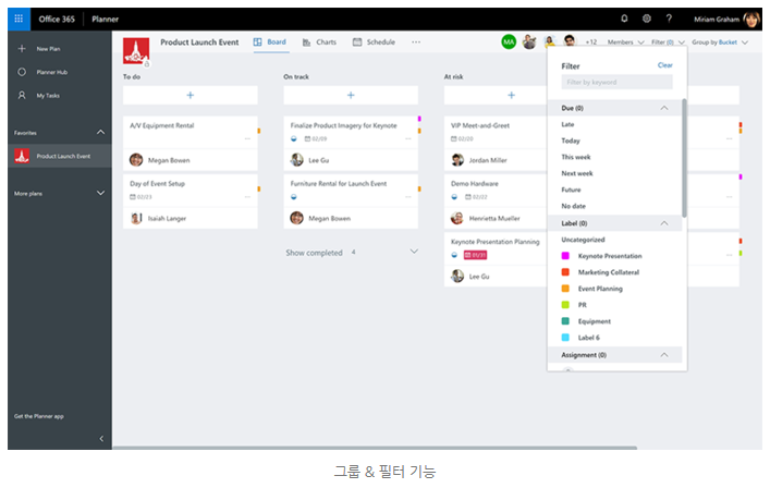 두 번째로 추가된 기능은 “그룹 & 필터 옵션”입니다. 이 기능은 MS플래너에서 관리하는 업무나 프로젝트들이 많아서 한 눈에 다 파악하기 어려울 때 효과적입니다. 예를 들어, 마감 기한이 얼마 남지 않은 업무들을 한 번에 파악하고 싶으면 “due date” 필터를 이용해서 마감일이 다가 온 항목들을 쉽게 파악할 수 있습니다. “그룹” 기능을 이용해서 아직 시작되지 않은 업무들을 파악하거나 업무들의 우선순위를 조절할 수 있습니다.