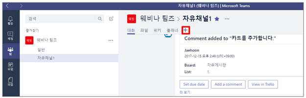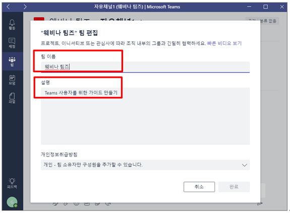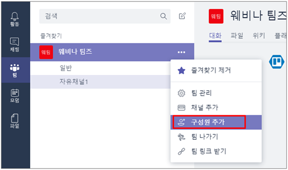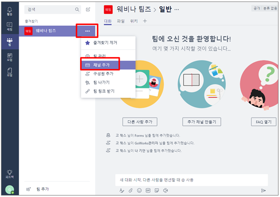 ⑤ 팀 생성 및 구성원 추가가 완료되면 채널 생성을 위해 팀 이름 옆에 있는 […] – [채널추가]를 클릭합니다. 여기서 채널이란, “팀의 토론주제” 라고 보시면 됩니다.