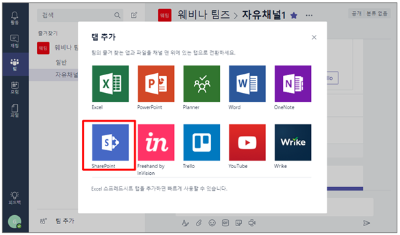 ⑧ 탭 추가 대화상자가 나오면 탭에 추가하기 위한 [SharePoint]앱을 선택합니다.
