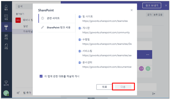 ⑨ [SharePoint] 앱 설정이 나오면 관련 사이트를 선택한 후, [다음]버튼을 클릭합니다.