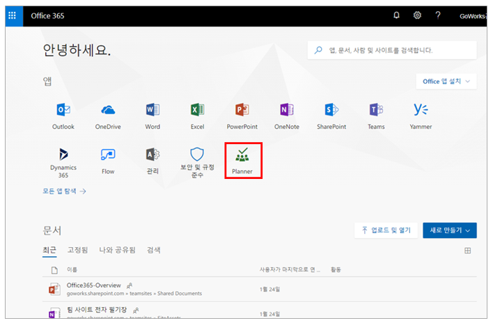 ① Office 365 홈포털 접속 후, [Planner]를 클릭하여 실행합니다.