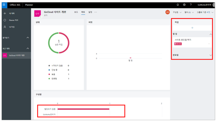 플래너에 있는 보드를 사용하여 팀 작업을 간편하게 구성할 수 있으며, 구성원중 누가 무엇을 하고 있는지와 진행상황의 진척도를 확인하고 작업에 대한 정보를 얻을 수 있습니다.