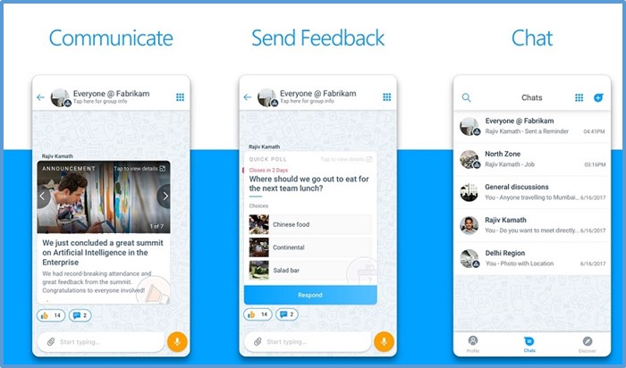 오피스 365에 새로운 모바일 챗 앱이 추가됩니다. 이름은 카이잘라고요. 카이잘라는 쉽고 안전하게 사용할 수 있는 모바일 챗 앱을 추구하는데 전화 번호로 사용자 인증을 하고 바로 사용할 수 있습니다. 카이잘라를 이용한 직장 동료, 파트너 및 고객과의 실시간으로 소통하고 협업이 더 원활해질 것 같습니다. 오피스 365 가입 고객에게 배포될 예정이며 기본 설정이 Off (사용하지 않음)이기 때문에 카이잘라 관리 포털에서 설정 값을 변경해야 사용할 수 있습니다. 카이잘라 프로 (Kaizala Pro) 라이선스는 오피스 365 사용자별로 할당되며, 오피스 365 사용자 계정으로 로그인해서 이용할 수 있습니다. 배포 일정은 아직 미정인데 발표되면 공유해 드리겠습니다. 아래는 카이잘라의 화면인데 향후에 정리해서 알려 드리죠.