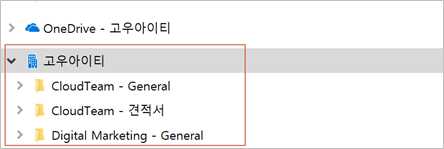 ② 비즈니스용 OneDrive 라이브러리를 동기화 시, 동기화 된 파일들은 파일 탐색기의 즐겨찾기 영역에서 찾을 수 있습니다(ShrePoint의 팀사이트 라이브러리를 OneDrive 로 동기화하면 OneDrive 폴더에 빨간 박스와 같이 동기화 되어 보여집니다)