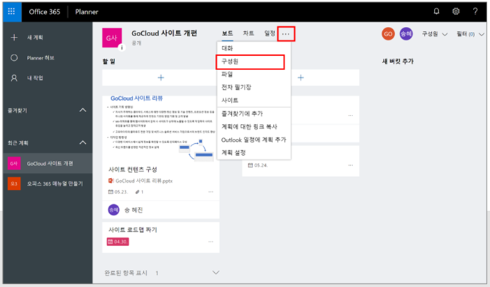 ② Planner 메인보드 화면 상단의 […]를 클릭 후 [구성원]을 클릭합니다.
