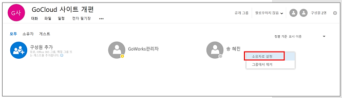④ 구성원 중 한 명을 선택하여 마우스 커서를 갖다 대면 […]이 생성되는데 구성원을 소유자로 설정하거나 그룹웨어에서 제거할 수 있습니다. [소유자로 설정]을 클릭합니다.