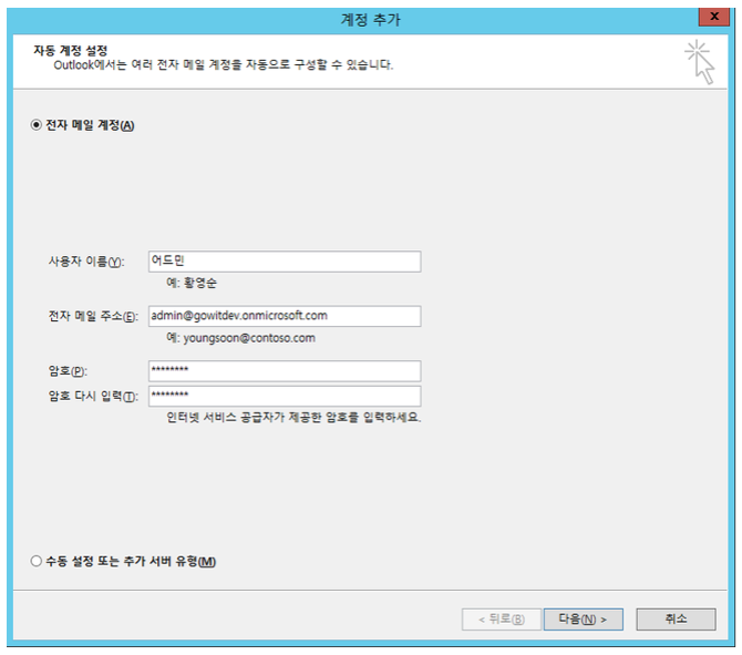 2. 계정 추가 화면에서 사용자이름, Office 365 로그인 계정, 암호를 입력합니다.