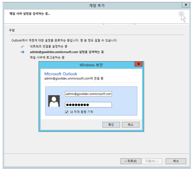 3. 로그인 연결창에서 오피스 365계정/암호 입력 후 내 자격증명 기억을 체크 후 [확인]을 클릭합니다.