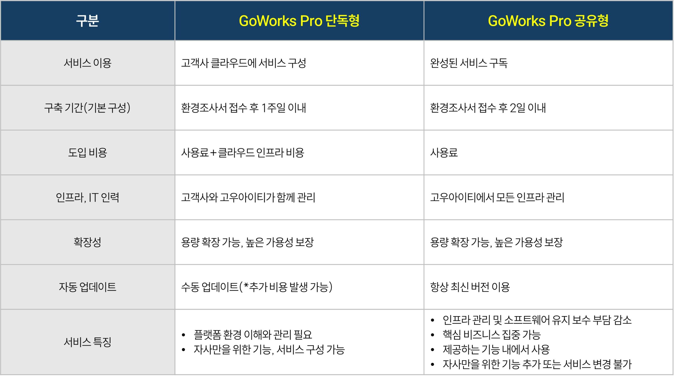 [표1] GoWorks Pro 단독형 vs. 공유형 비교표 (출처 : 고우아이티)