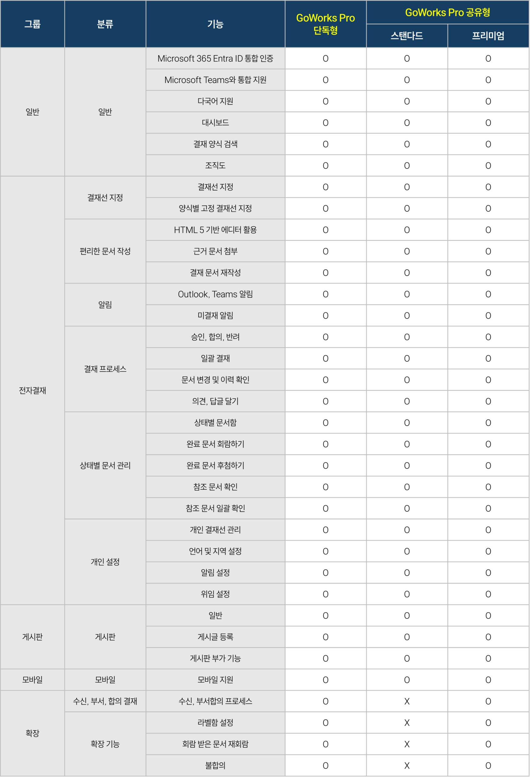 [표2] GoWorks Pro 단독형 vs. 공유형 제공 기능 비교표 (출처 : 고우아이티)