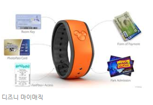 IoT와 빅데이터를 활용한 다른 사례를 보겠습니다. 디즈니가 디즈니랜드에 입장한 고객들에게 사용하는 MyMagic+ 라는 이름의 밴드입니다. 고객이 이 밴드를 착용하면 디즈니는 고객들이 디즈니랜드의 어는 곳에 있는지 실시간으로 파악할 수 있습니다. 그런데 고객들은 기꺼이 이 밴드를 이용합니다. 이를 통해 한 시간씩 줄을 서지 않고도 놀이 기구를 효과적으로 즐길 수 있는 예약 서비스뿐만 아니라 현재 진행되거나 조만간 예정된 이벤트 정보 그리고 특정 지역으로 이동할 때 가장 빠른 경로 정보 등을 스마트폰을 통해 제공받을 수 있기 때문입니다.