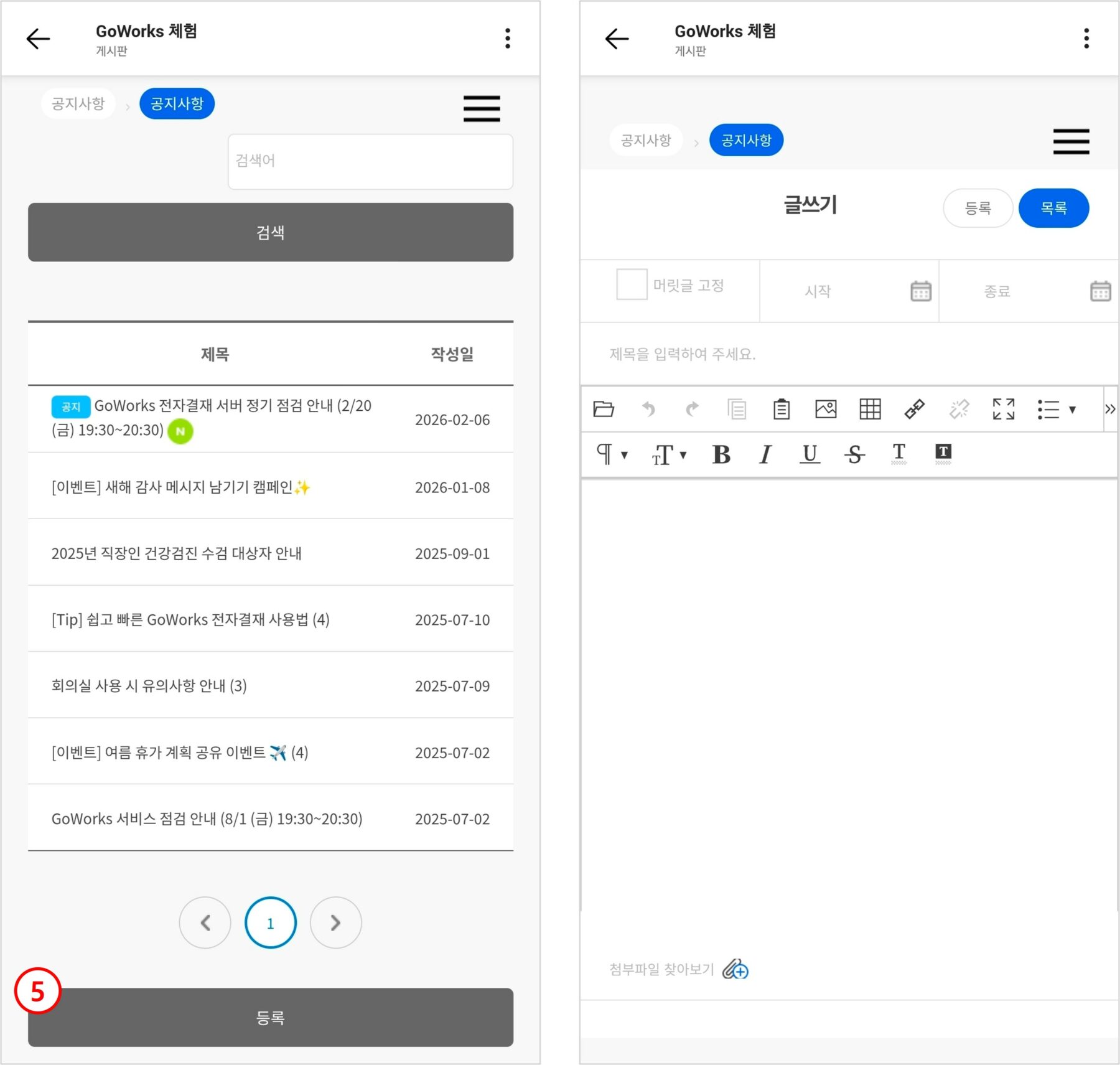 [등록] 버튼을 클릭하면 선택한 게시판에 게시글을 등록할 수 있습니다. 머리글 고정 기간을 설정할 경우, 게시글 목록 상단에 공지 아이콘과 함께 게시글이 고정됩니다. 중요 공지나 반복적으로 안내해야 하는 내용은 고정 기능을 활용하면 구성원들이 놓치지 않고 확인할 수 있습니다.