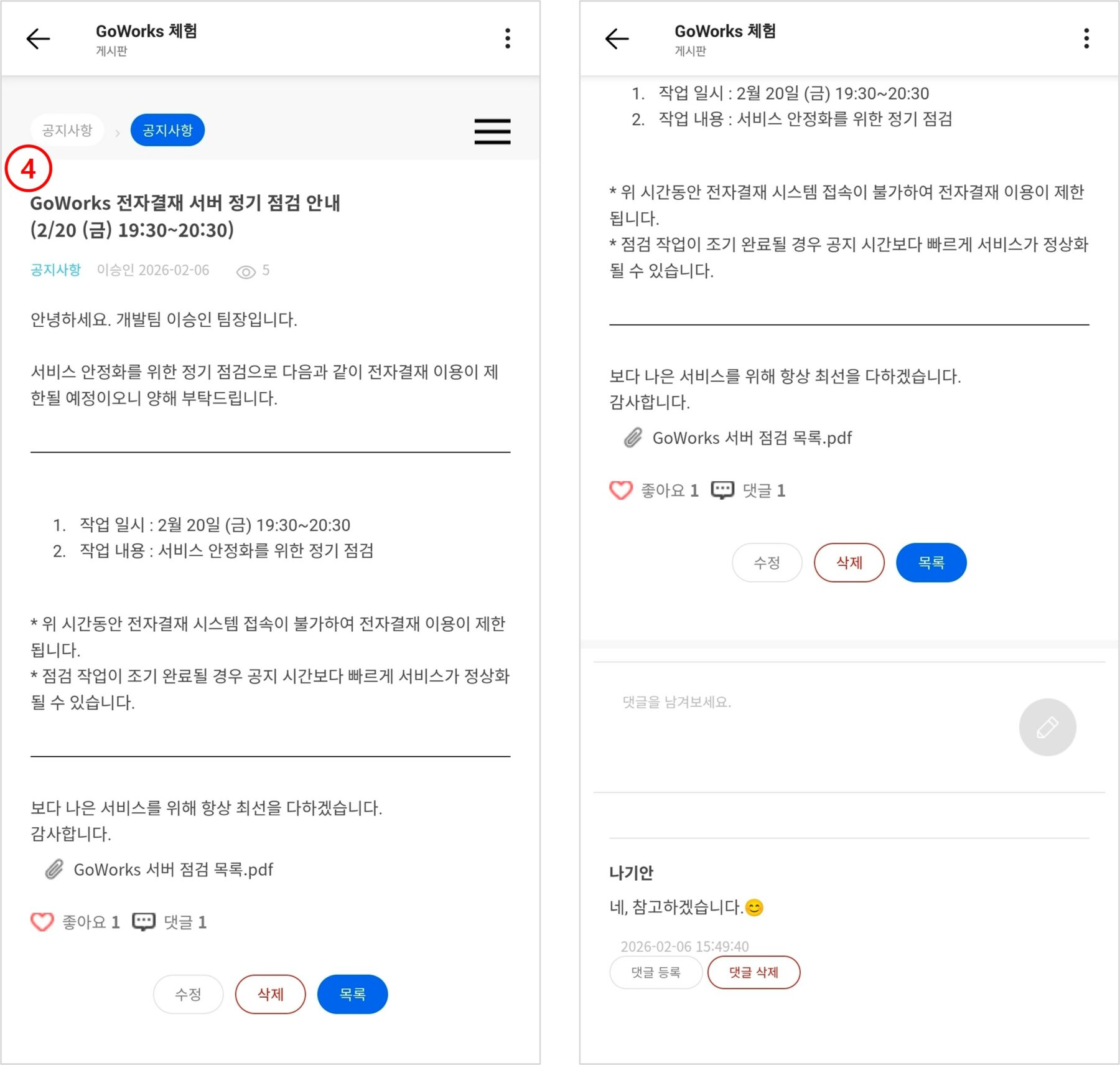 제목을 클릭하여 게시글 본문으로 이동하면 게시글에 좋아요를 표시하거나 댓글을 작성하여 의견을 남길 수 있습니다. 사용자 본인이 작성한 게시글은 [수정, 삭제] 버튼이 표시되어 모바일에서도 게시글을 관리할 수 있습니다.