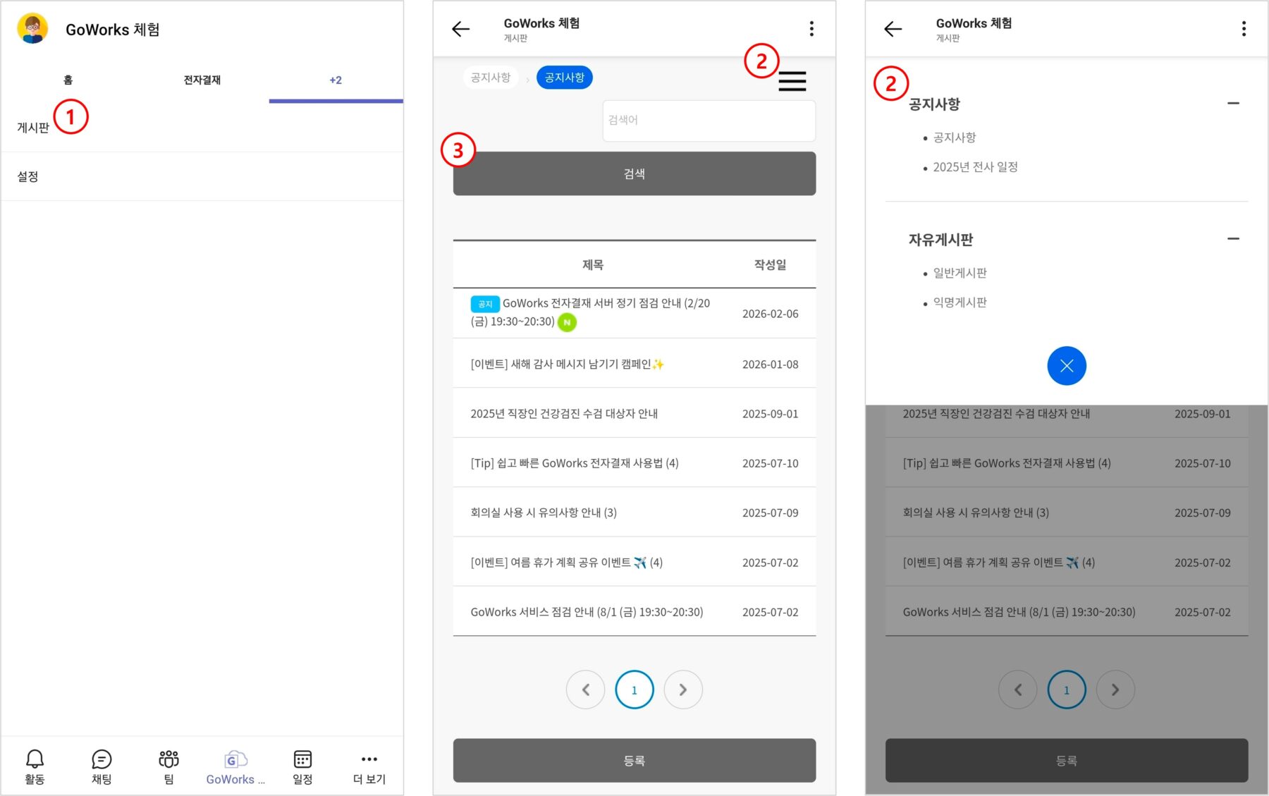상단의 [+2]를 클릭하여 [게시판] 메뉴로 이동합니다.