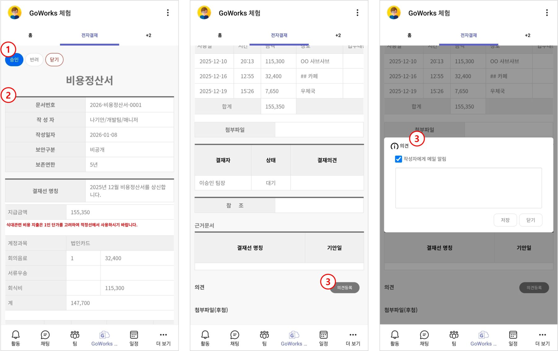 결재 의견에 미처 남기지 못한 문의 및 요청사항이 있을 경우 의견 등록 기능을 활용하여 소통할 수 있습니다. |