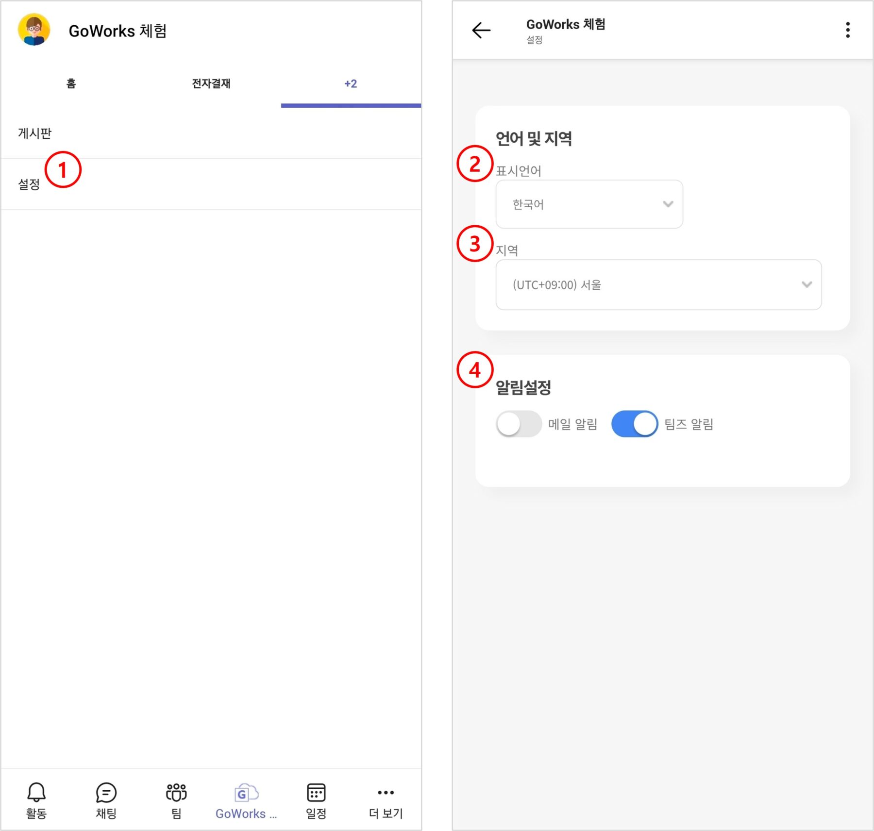 : 전자결재에 표시되는 언어, 시간과 알림 설정을 변경할 수 있나요?