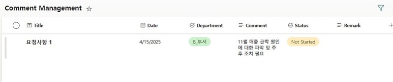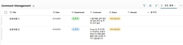 Power BI 보고서에 SharePoint 목록을 데이터 원본으로 하는 Power Apps 앱 삽입을 통해 보고서 안에서 바로바로 코멘트를 작성하고 저장할 수 있습니다. 사용자들은 실시간으로 코멘트를 남기고 코멘트를 목록 형태로 정리하여 관리할 수 있기 때문에 도중에 관련하여 이야기를 나누고자 별도 커뮤니케이션 도구에 액세스할 필요없이 흐름이 끊어지지 않고 업무와 함께 쭈욱 이어갈 수 있습니다.