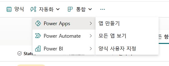 먼저 데이터 원본으로 하는 SharePoint 목록이 있는 상태에서 해당 목록을 데이터 원본으로 하는 Power Apps를 만들기 위해서는 [통합] > [Power Apps] > [앱 만들기]를 클릭하여 시행합니다.