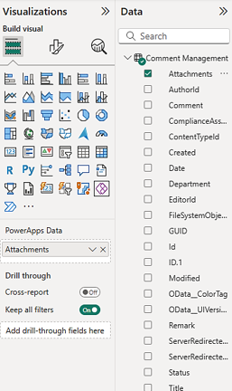 ⑤ 해당 시각화 개체의 크기를 조정하고 필드를 하나 이상 바인딩하면 Power Apps 시각화 개체에서 기존 앱 선택(Close App) 또는 새로운 앱 생성(Create New) 옵션이 나타납니다. 이미 SharePoint 목록을 데이터 원본으로 하는 앱을 생성한 상태이기 때문에 [Close App]를 클릭한 후 생성 및 게시한 앱을 선택하면 됩니다.